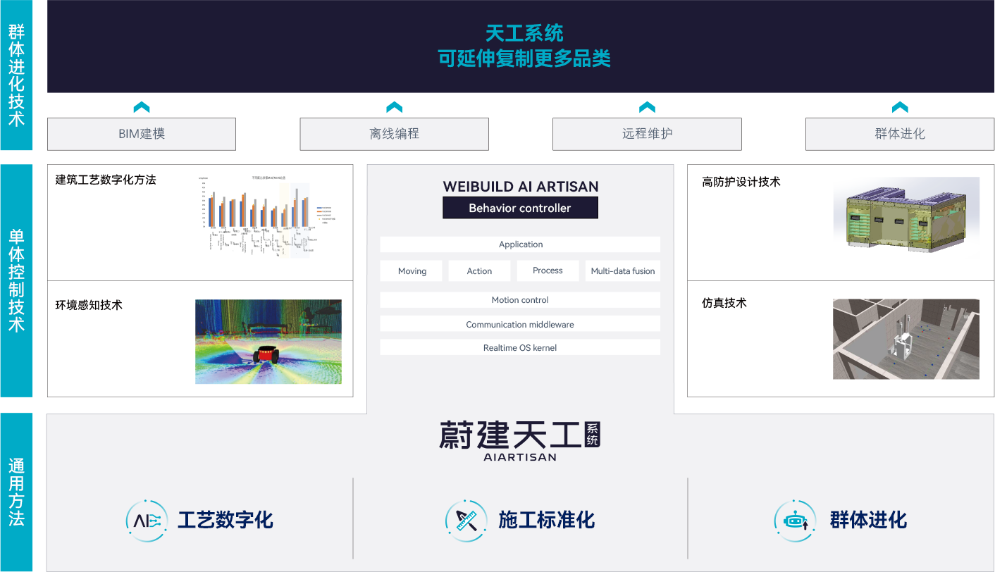 天工系统搭配高精度的机械作业设备,做到超越人工的作业能力,实现泵、抹、压、收四个工序一步完成